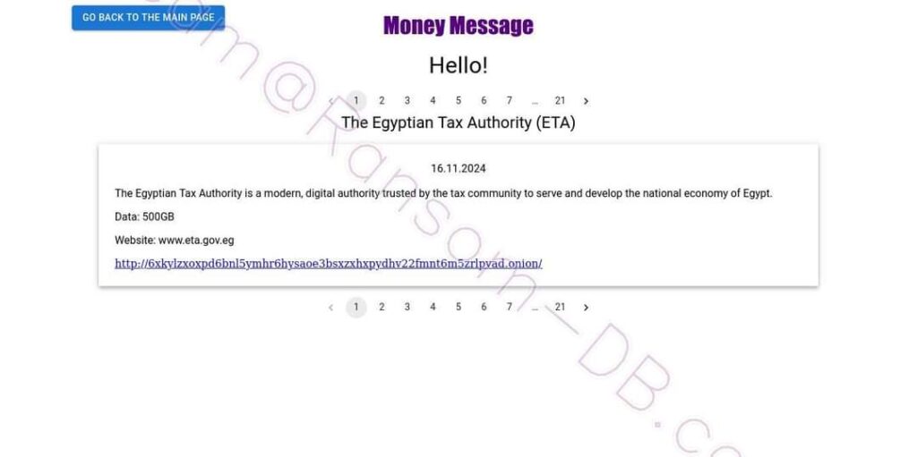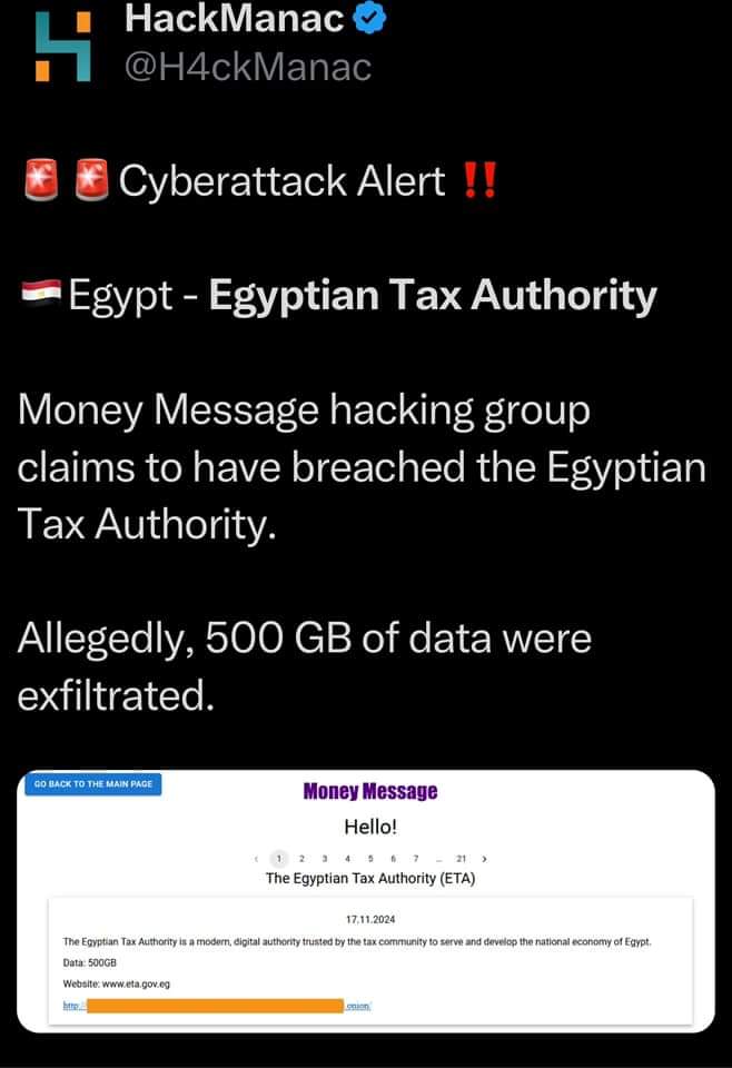 في تطور خطير أثار جدلًا واسعًا، أعلنت مجموعة قرصنة إلكترونية تُعرف باسم Money Message عن اختراقها لنظام مصلحة الضرائب المصرية. وبحسب تصريحات المجموعة، فقد استولت على 500 جيجا بايت من البيانات الحساسة المتعلقة بالمؤسسات والأفراد.
