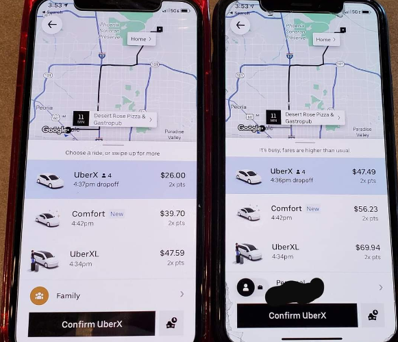 أثار ناشطون على وسائل التواصل الاجتماعي شكوكًا حول سياسة تسعير رحلات أوبر، مدعين أن الشركة قد ترفع الأسعار بناءً على حالة شحن بطارية هاتف الراكب. تُشير هذه الادعاءات إلى أن أوبر تستغل العامل النفسي للركاب الذين يعانون من انخفاض شحن بطارية هواتفهم، حيث يصبحون أكثر عرضة للموافقة على أسعار مرتفعة بسبب حاجتهم إلى حجز الرحلة بسرعة.