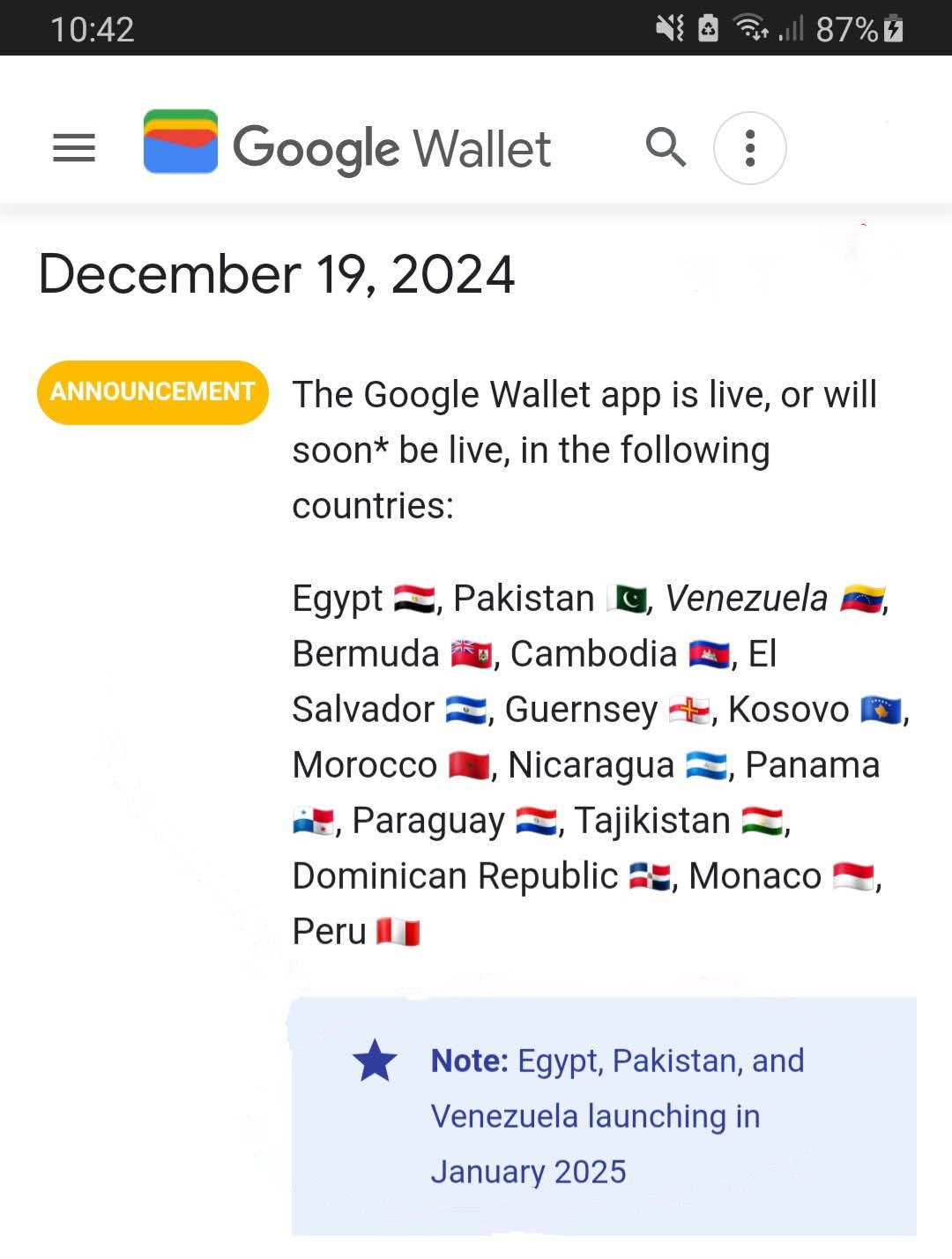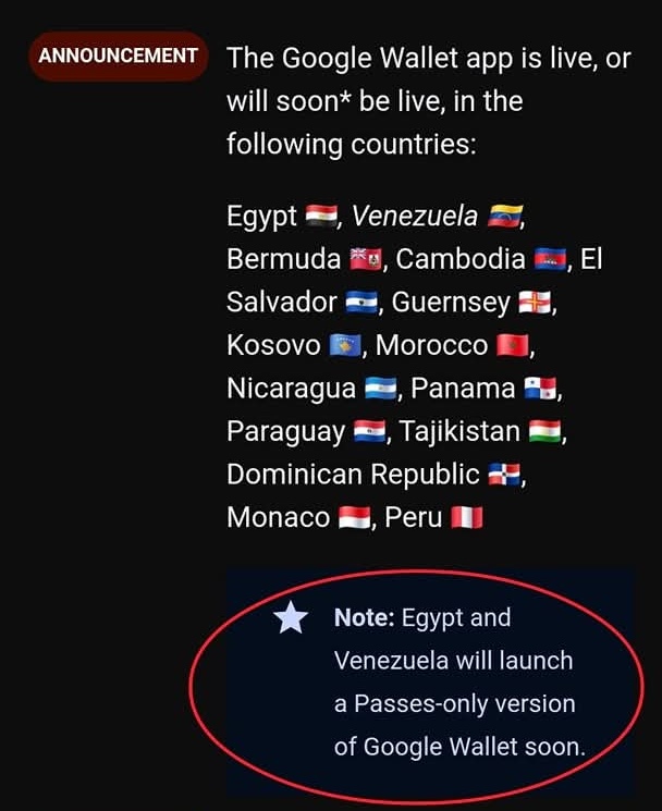 مؤخرًا، قامت شركة جوجل بإجراء تعديل على إعلانها بشأن توفر خدمة Google Wallet (محفظة جوجل) في مصر ودول أخرى. التغيير الجديد ركز على تحديد الدول المشمولة بالخدمة، وهما: مصر وفنزويلا، مع توضيح أن الخدمة في هذه الدول ستكون محدودة لتقديم إصدار “Passes” فقط.