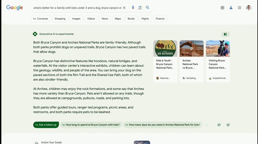 ومن المتوقع أن يتم عرض هذه اللمحات في الجزء العلوي من صفحة النتائج، وستختلف صيغ وتخطيطات اللمحات اعتمادًا على الإجابة. وسيتم عرض ترشيحات لعمليات البحث التالية، ومن ذلك القدرة على طرح أسئلة مُتابَعة. وعند النقر عليها، يدخل محرك البحث في وضع محادثة جديد حيث يمكن طرح الأسئلة المتعلقة بالموضوع الذي تستكشفه.