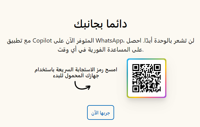 إضافة Copilot إلى واتساب سهلة للغاية. يمكن للمستخدمين مسح رمز الاستجابة السريعة (QR) المتاح على الموقع الرسمي لمايكروسوفت هنا أيضا إذا لم يعمل الرابط بالأعلى معك .