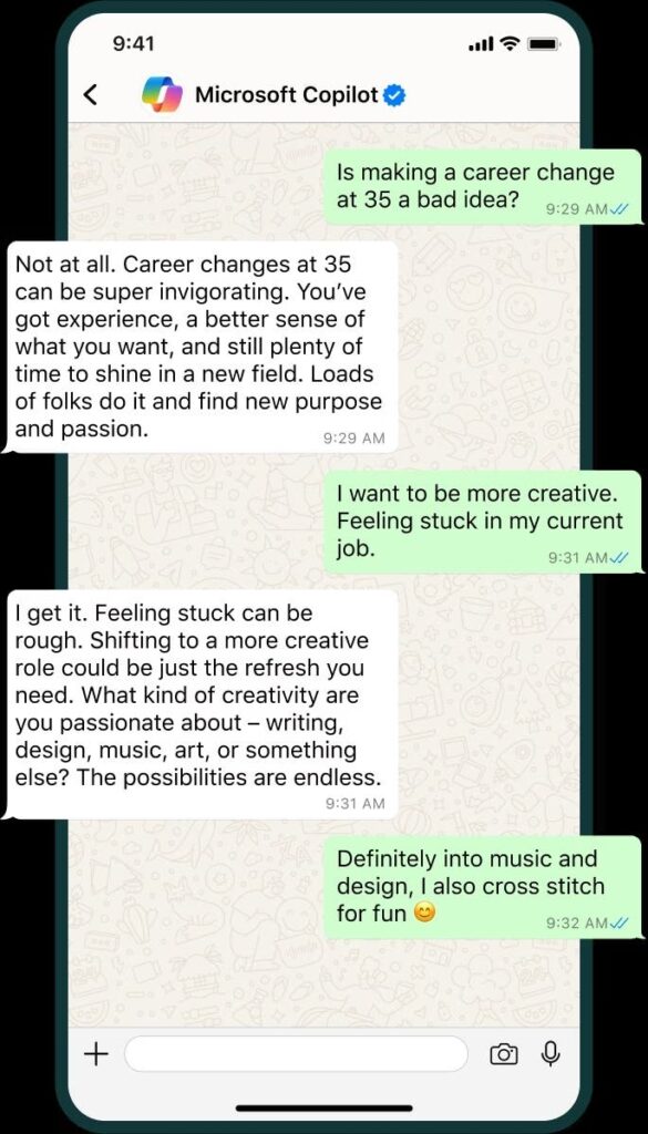 بمجرد المسح، سيتم إضافة المساعد الذكي إلى قائمة جهات الاتصال الخاصة بك. ومن هناك، يمكنك الدردشة مع Copilot تمامًا كما تفعل مع أي جهة اتصال أخرى. المساعد جاهز لمساعدتك في مجموعة واسعة من الطلبات، من الأسئلة البسيطة إلى المهام المعقدة.