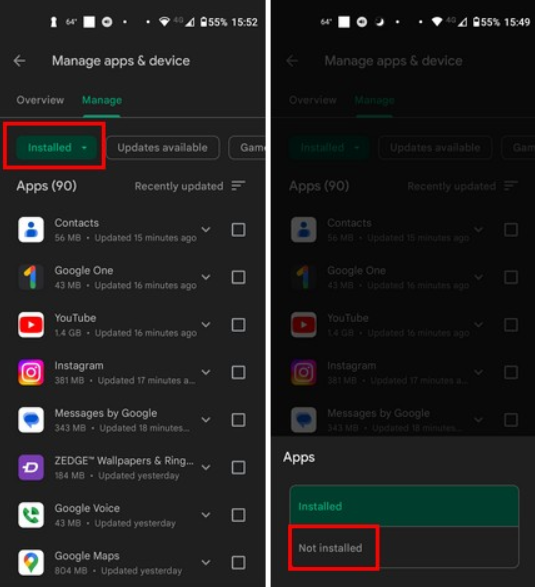يمكنك العثور على قائمة التطبيقات التي تم إلغاء تثبيتها عن طريق فتح تطبيق Google Play والنقر على صورة ملفك الشخصي. اضغط على إدارة التطبيقات والجهاز ، متبوعا بعلامة التبويب إدارة في الأعلى. في علامة التبويب “إدارة” ، سيتم تمييز الخيار المثبت. اضغط عليها واختر غير مثبت.