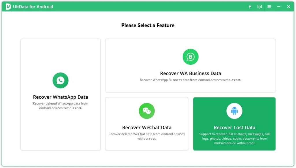الخطوة 1: قم بتنزيل Tenorshare UltData for Android وتثبيته على الكمبيوتر وتشغيل البرنامج. حدد “استعادة البيانات المفقودة” من الواجهة الرئيسية ؛