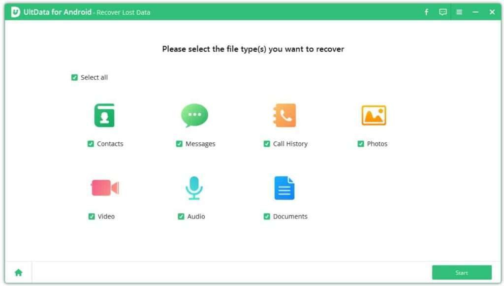 الخطوة 3: عندما يكتشف Tenorshare Android Data Recovery هاتفك ، حدد أنواع الملفات التي تريد استردادها وانقر فوق “ابدأ” لفحص هاتفك بحثًا عن البيانات المفقودة ؛