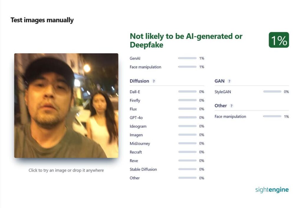 Sightengine مش أداة مثالية، لكنه بيديك فكرة مبدئية كويسة عن الصور اللي فيها احتمال تزييف. ومع الوقت والتطور اللي بيحصل في الذكاء الاصطناعي، هنحتاج أدوات أقوى وأدق. لكن لحد ما نوصل للنقطة دي، لازم نعتمد على مزيج من الأدوات والتحليل البشري علشان نكتشف المحتوى الزائف.