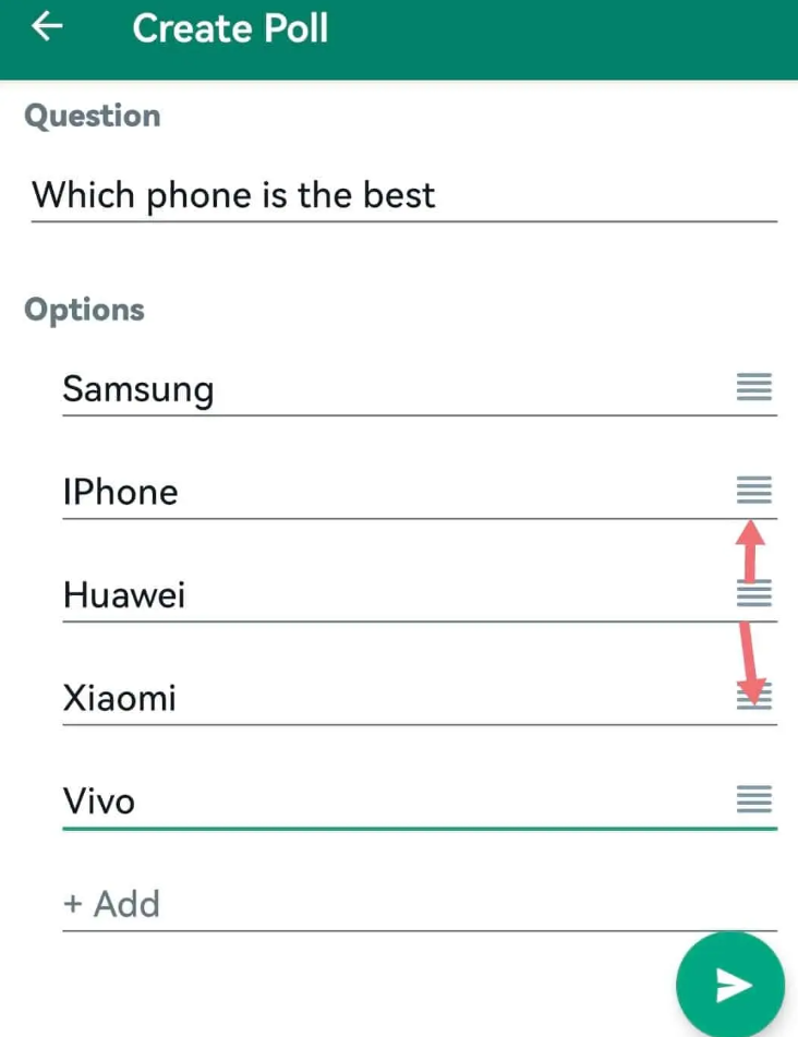 الخطوة 5. بعد إدراج جميع خيارات الرد الخاصة بك ، ما عليك سوى النقر على زر الإرسال لمشاركة استطلاع الرأي الخاص بك في دردشة واتساب . يمكنك أيضًا إعادة ترتيب خيار الاستجابة إذا كنت لا تحب الترتيب وللقيام بذلك ، ما عليك سوى النقر مع الاستمرار على الخطوط الأفقية الأربعة على الجانب الأيمن من خيارات الاستجابة والسحب إما لأعلى أو لأسفل لإعادة الترتيب.